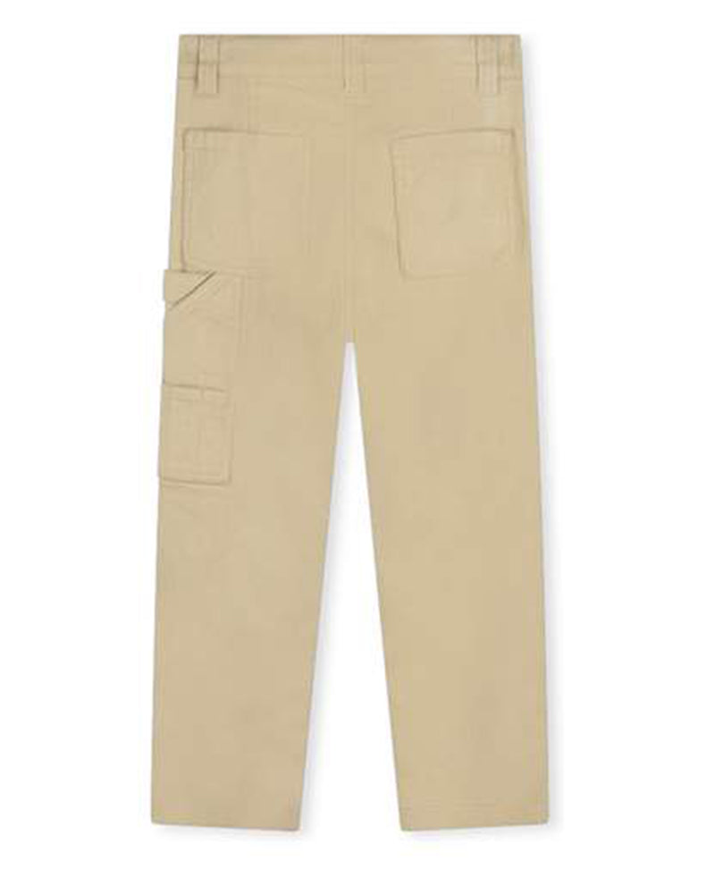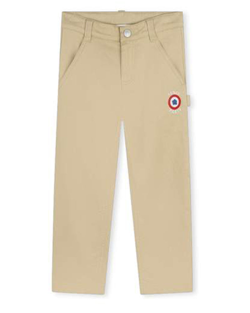Pantaloni beige sabbia realizzati in denim di cotone. Presentano chiusura frontale con bottone a pressione e zip, vita regolabile grazie ad elastico interno con bottoni, due tasche laterali all'americana e due tasche applicate sul retro. Sono decorati con patch logo applicata sul davanti.