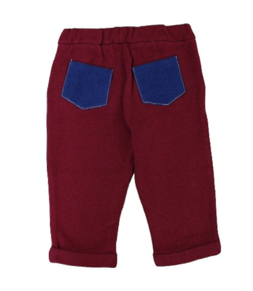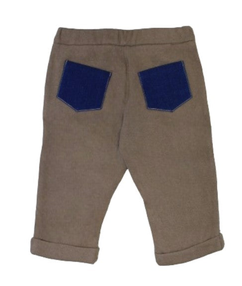 Wool blend trousers with straight leg, cuffed hem, drawstring waist, side slant pockets, contrasting back pockets.