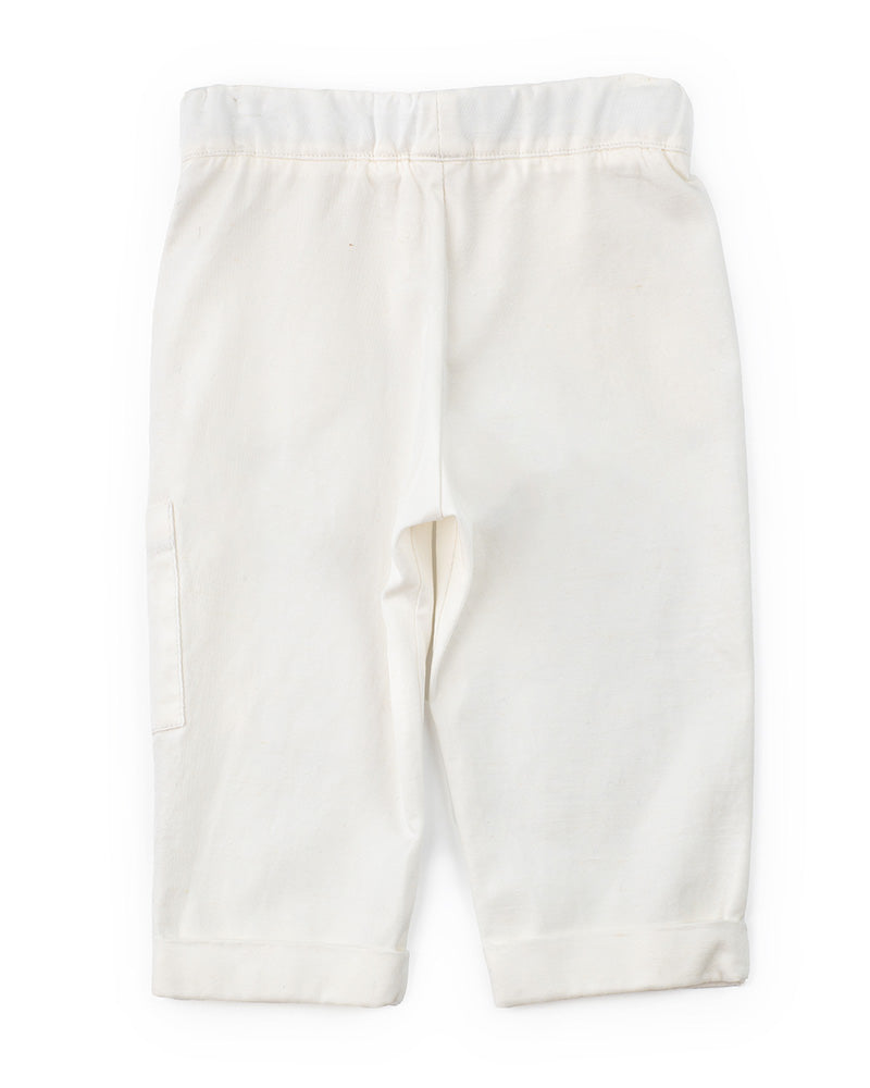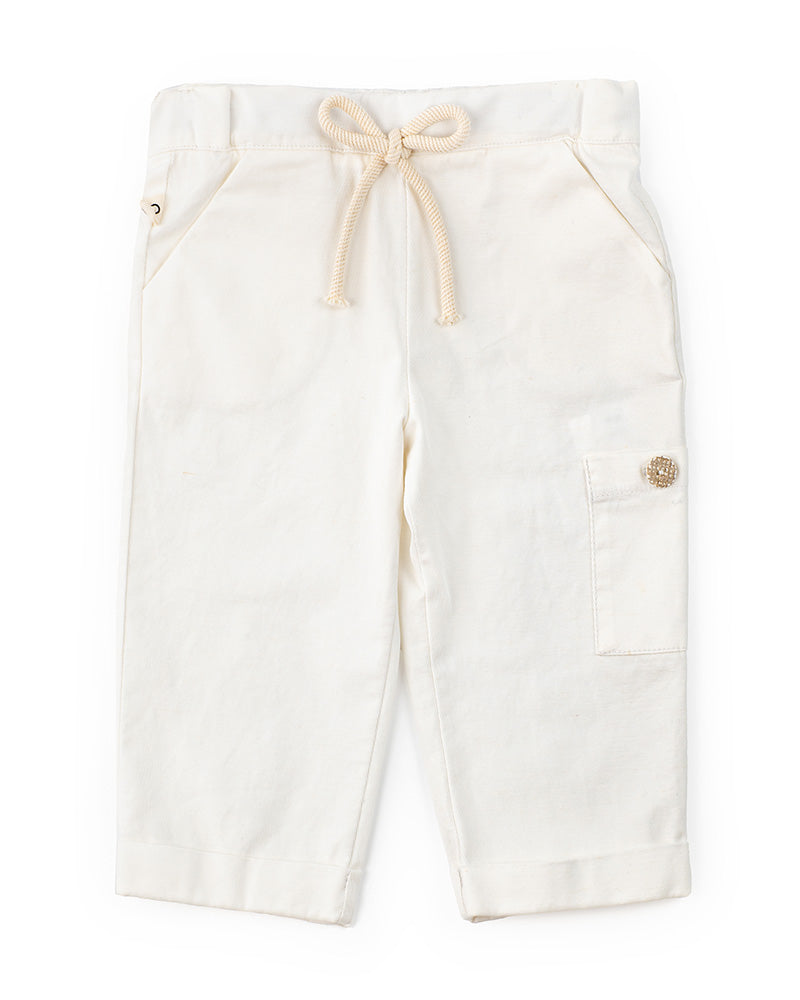 Pantaloni realizzati in misto lino, vita elasticizzata con coulisse in vita, tasche laterali, tasche applicate sulla gamba.