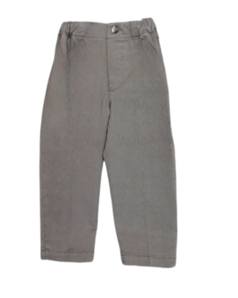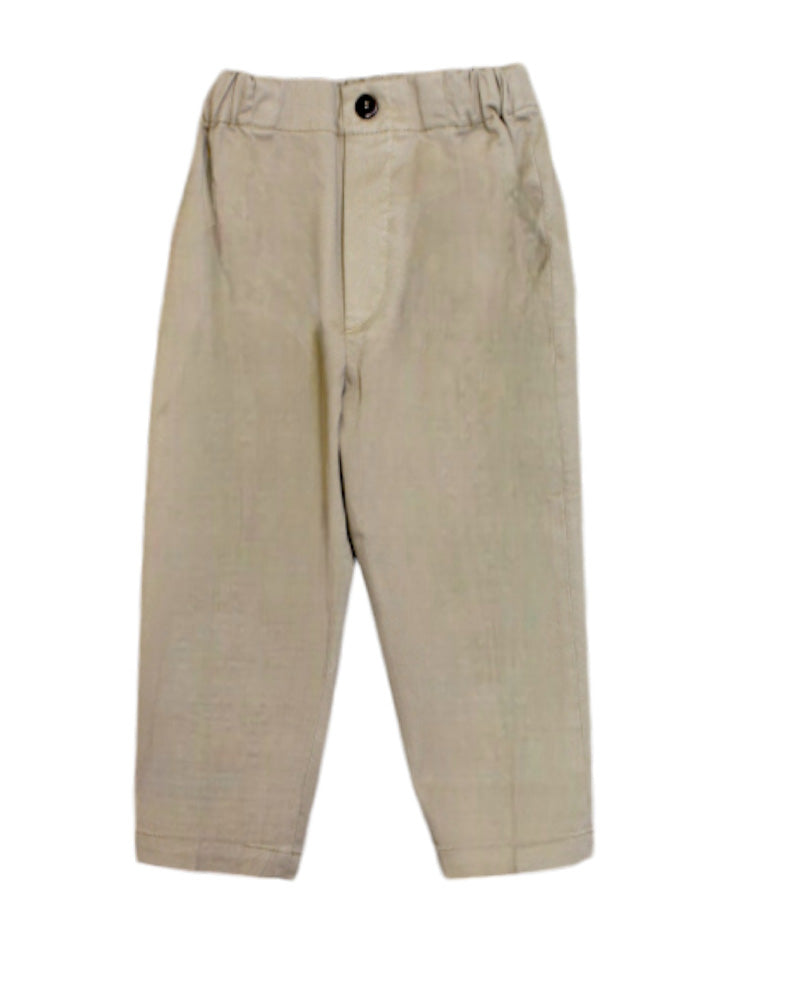 Garment-dyed canvas trousers, elasticated waist, fake button and zip on the front, patch pockets on the back.