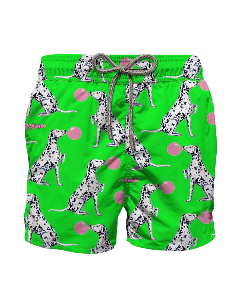 Boxer mare di media lunghezza realizzato in poliestere riciclato. Presenta vita elasticizzata con coulisse, tasche laterali e tasca con patta sul retro, fodera interna in rete. È decorato con stampa dalmata all-over e patch logata sul retro.