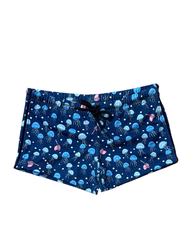 Costume da bambino realizzato in lycra, modello parigamba. Presenta vita elasticizzata con coulisse, stampa all-over e patch logata sul taschino posteriore.