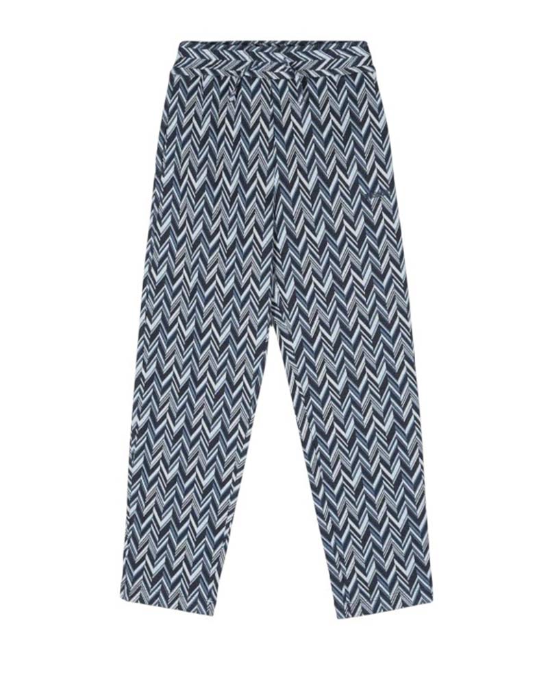 Pantaloni realizzati in maglia di cotone con motivo zig zag ad intarsio, vita elasticizzata con coulisse, tasche laterali a filo e logo ricamato sul davanti.