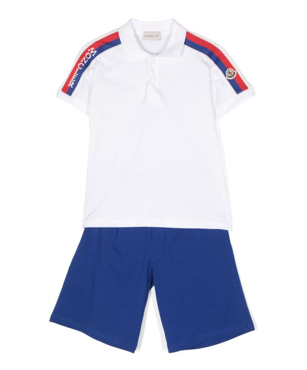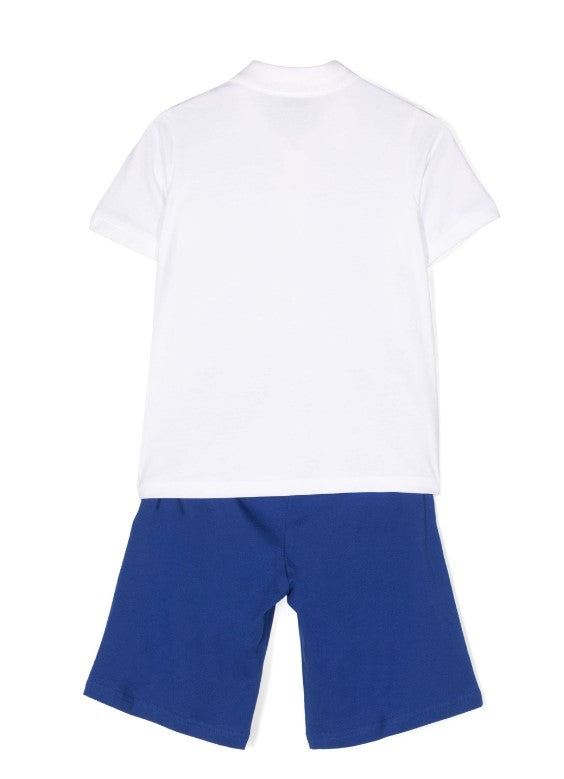 Two-piece set consisting of a polo t-shirt with bands on the sleeves and shorts with American pocket and logo applied on the back.
