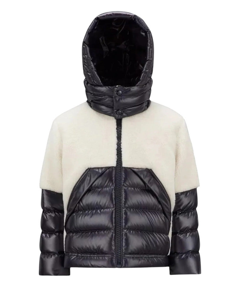 Bi-fabric jacket with removable hood, quilted design. Features front zip closure, two front pockets, logo patch application on the sleeve, feather padding, elasticated cuffs.