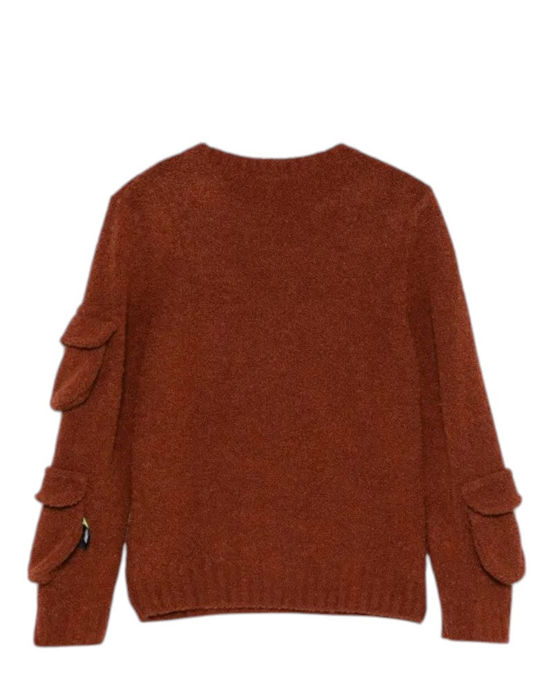 Maglia realizzata in filato bouclé da bambino. Presenta collo rotondo, maniche lunghe con tasche applicate, orlo dritto e finiture a coste.