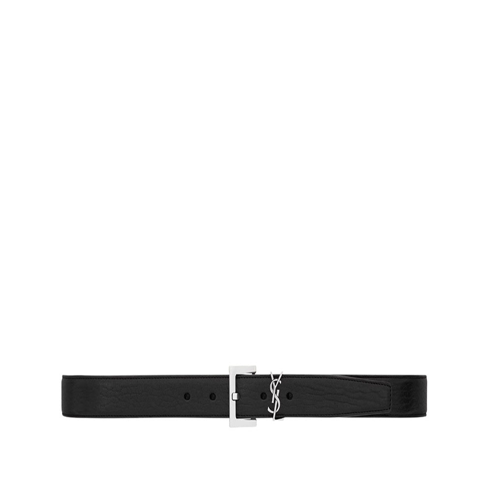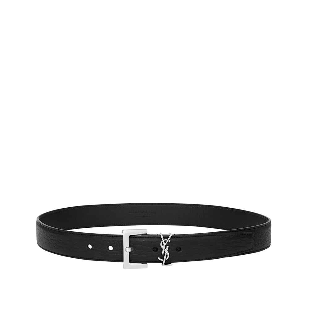 Cintura YSL in pelle martellata senza metalli, con fibbia quadrata regolabile e passante con monogramma.