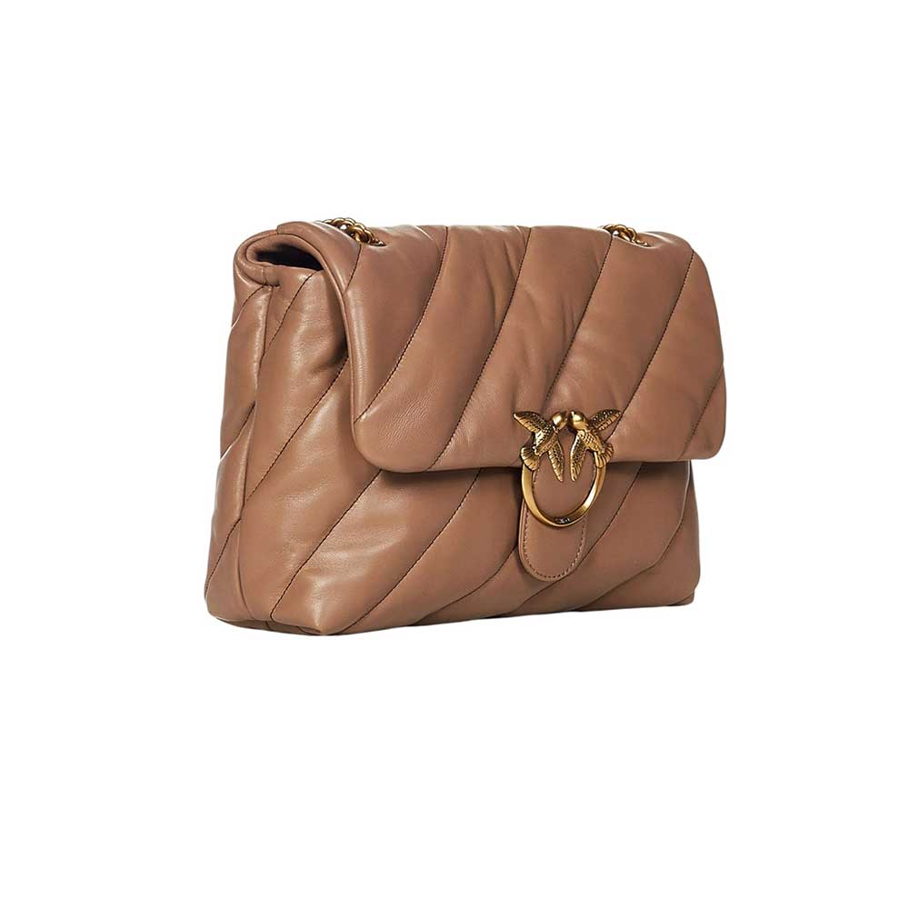 La Big Love Bag Puff Maxi Quilt è una borsa iconica in morbida nappa, caratterizzata da una maxi trapuntatura obliqua che le conferisce un'eleganza senza tempo. La chiusura è arricchita dall'iconica fibbia metallica Love Birds Diamond Cut, un simbolo di raffinatezza e stile. L'interno, foderato in microfibra scamosciata, è progettato per offrire una praticità ottimale, con una tramezza chiusa con zip e una tasca a parete per organizzare al meglio i tuoi effetti personali. La tracolla combina la classica catena metallica rotonda con un pratico spallaccio in nappa, garantendo comfort e resistenza.