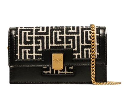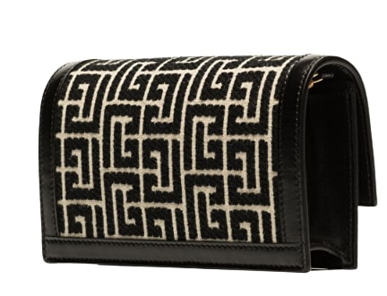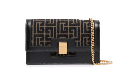 Balmain bag decorated with a black and CAMEL jacquard motif, the 1945 mini bag by Balmain features leather inserts and a gold clasp with tone-on-tone logo.