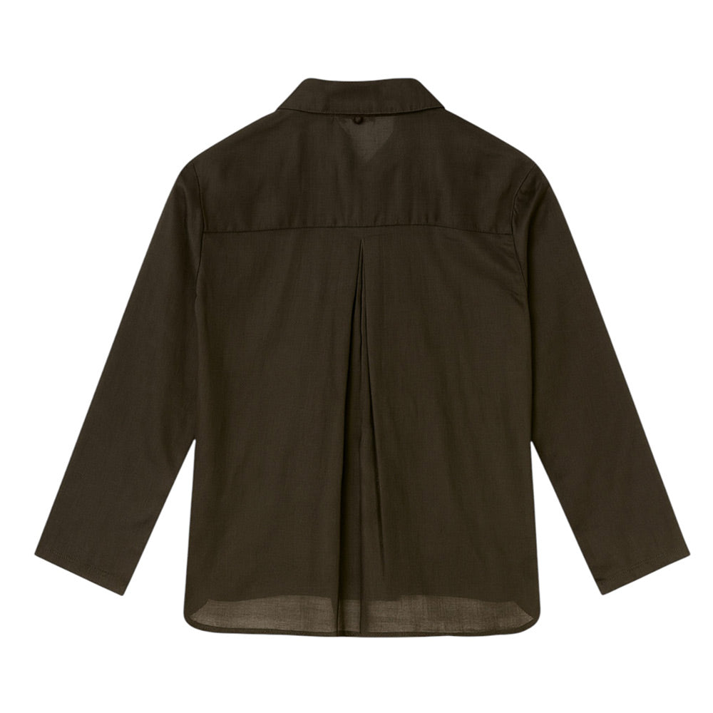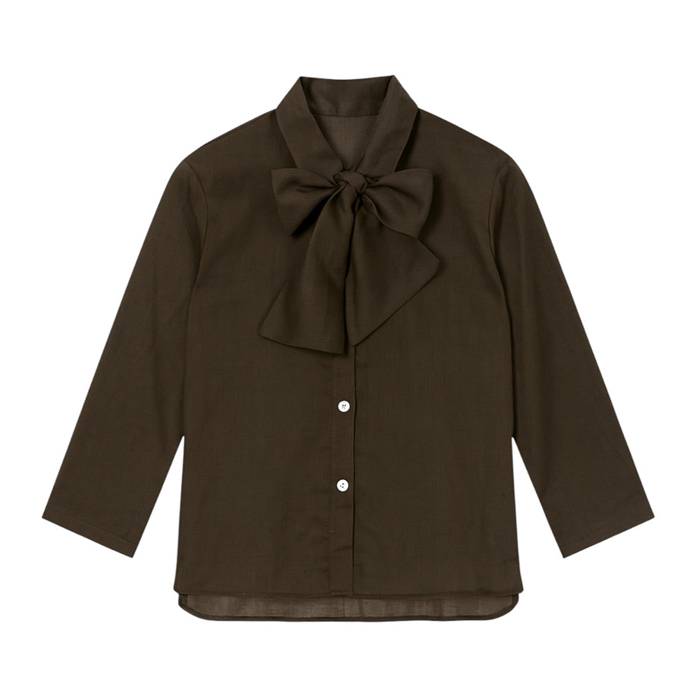 Camicia realizzata in cotone, caratterizzata da colletto a punta, chiusura frontale con bottoni, maniche lunghe e orlo asimmetrico. È decorata con fiocco al collo.