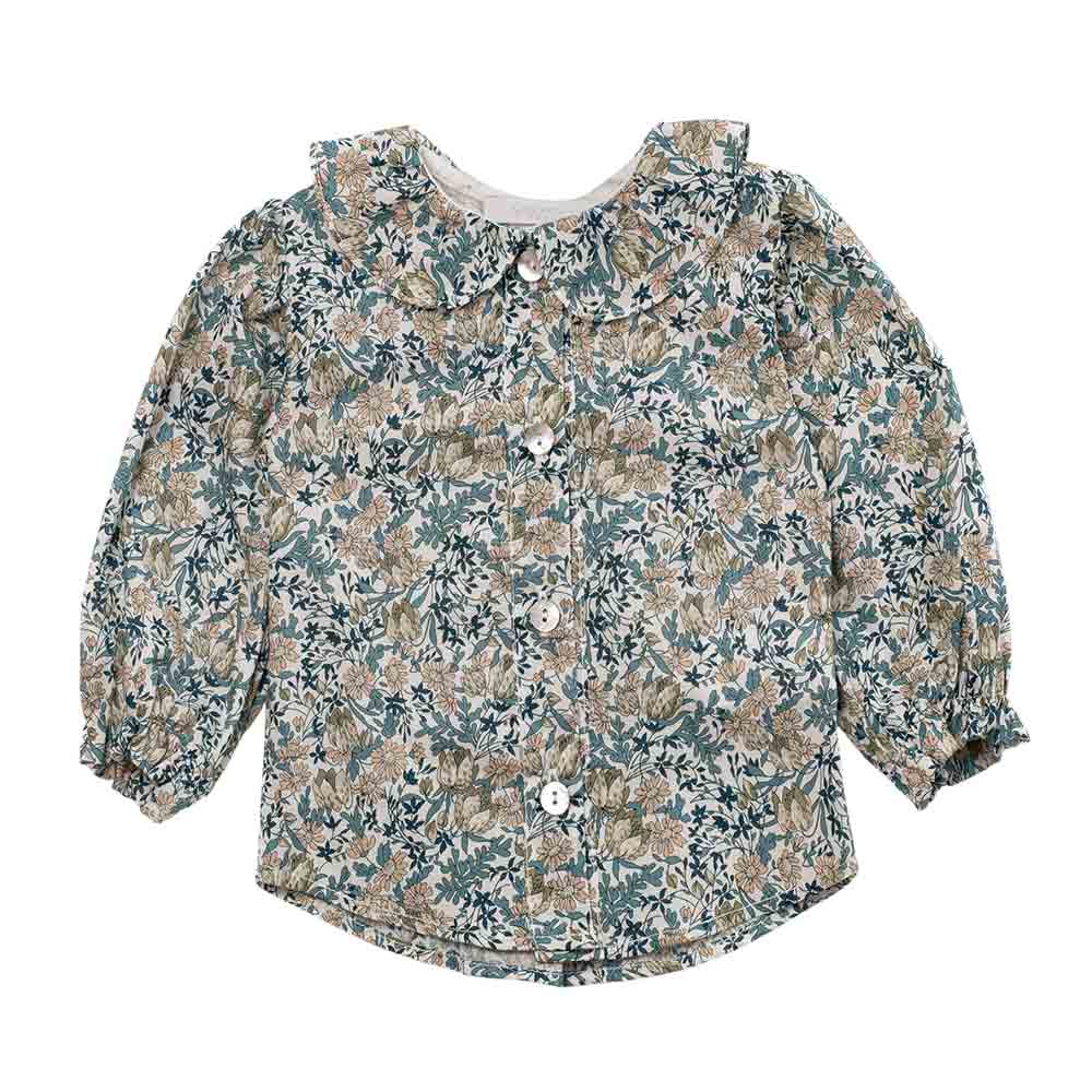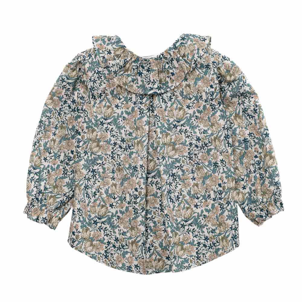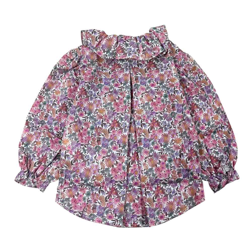 Camicia realizzata in popeline di cotone, caratterizzata da colletto rotondo con ruches, chiusura frontale con bottoncini, maniche lunghe con polsini elasticizzati e orlo curvo. È decorata con fantasia floreale all-over.