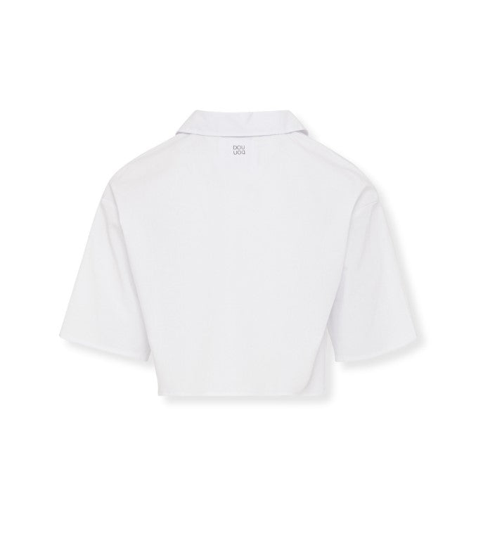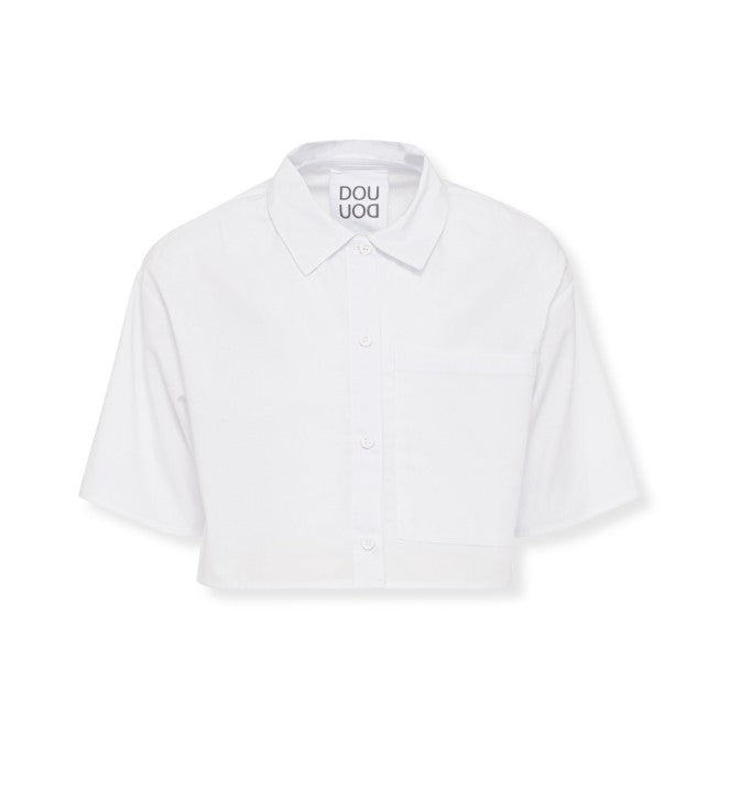 Girls' cropped shirt with collar, front button fastening, front patch pocket.