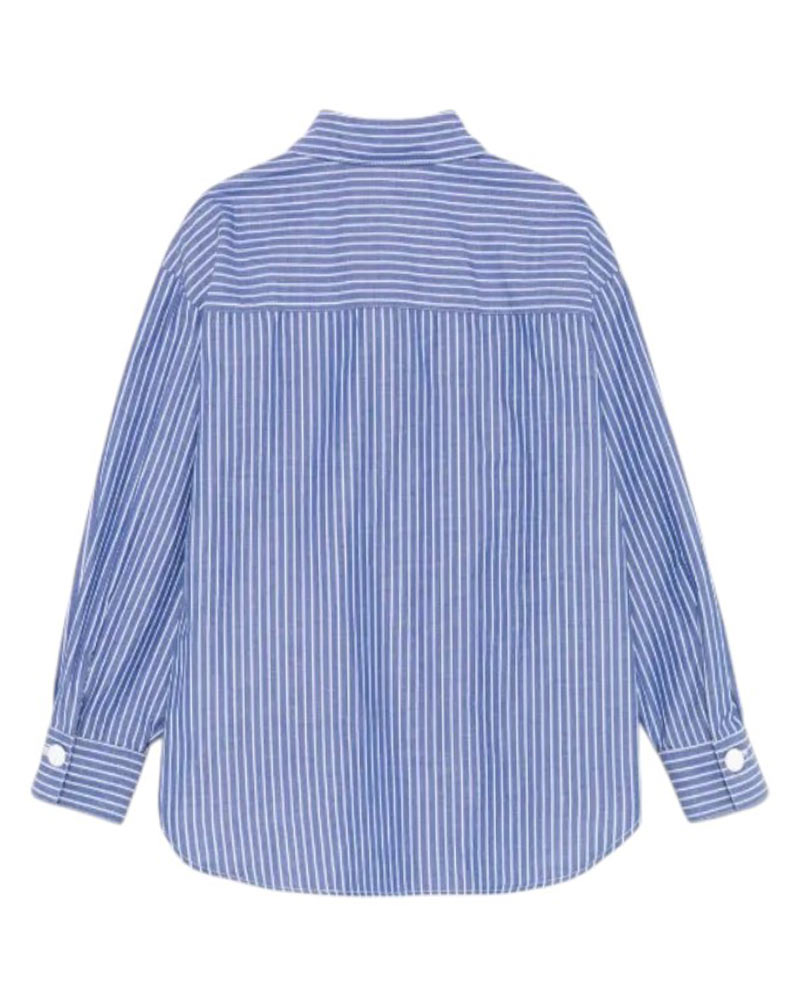 Camicia da bambina realizzata in popeline di cotone. Presenta fantasia a righe all-over, colletto a punta, chiusura frontale nascosta con bottoni, maniche lunghe e taschino applicato sul petto.