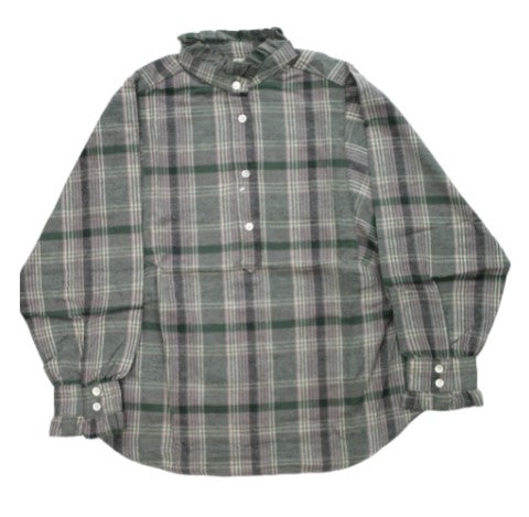 Checked shirt, mandarin collar, ruffles on the neck and sleeves.