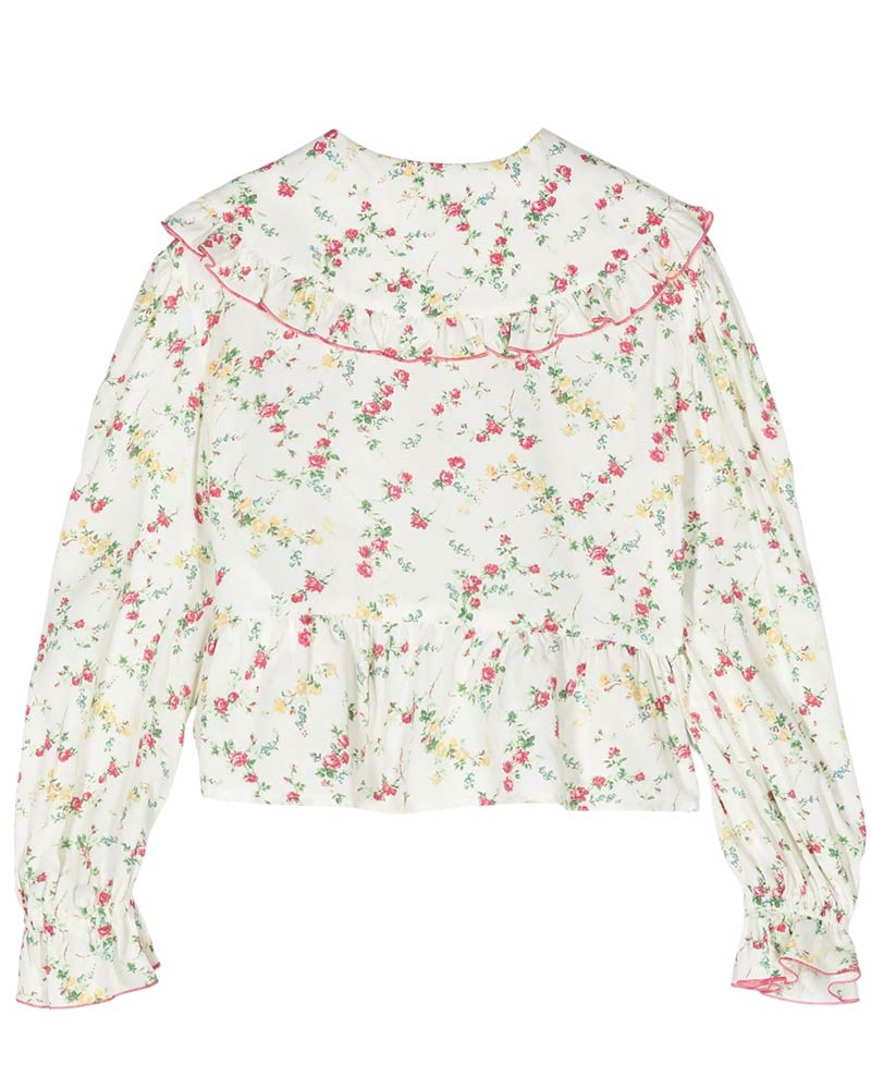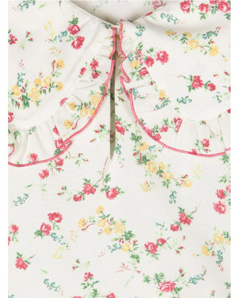 Camicia cropped realizzata in viscosa da bambina. Presenta fantasia a fiori all-over, colletto ampio con volant, chiusura frontale con bottoncino, maniche lunghe con polsini elasticizzai e balze sul fondo.