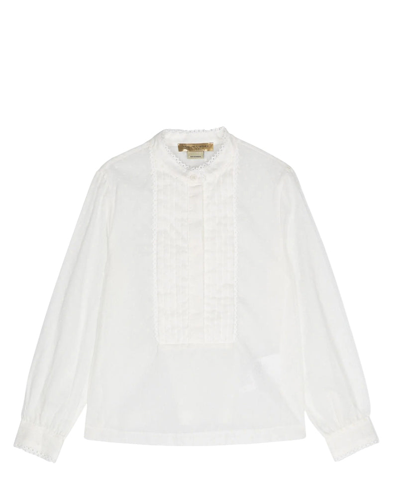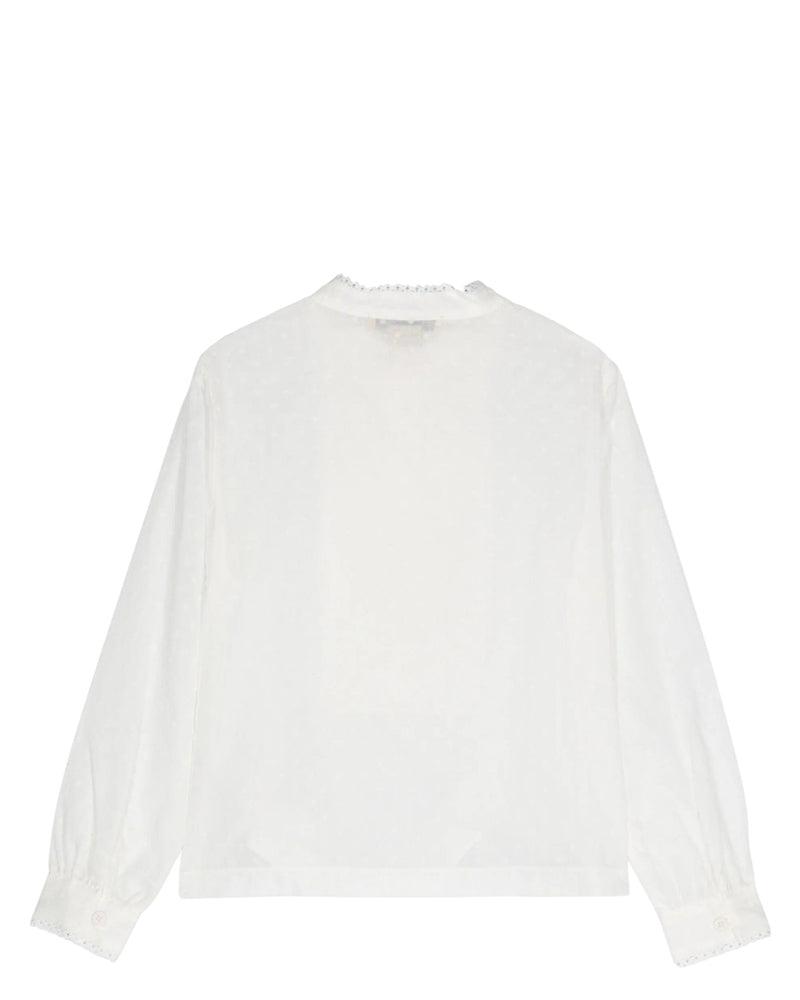 Camicia in cotone con motivo a pois e dettagli plissettati da bambina. Presenta colletto alla coreana, chiusura frontale con bottoni, maniche lunghe, orlo dritto.