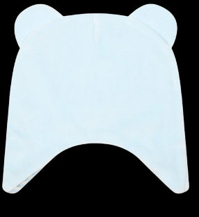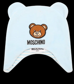 Moschino hat with earflaps. It is decorated with a colored teddy bear, embroidered black logo and ears on the top.