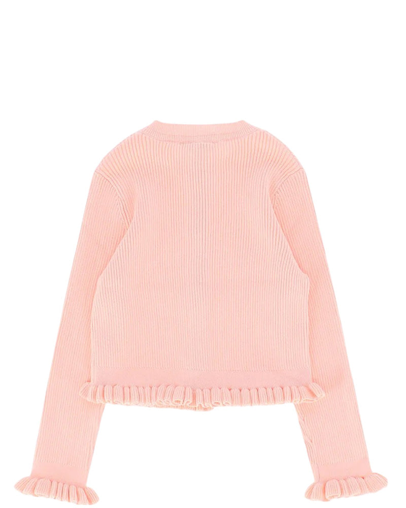 Cardigan realizzato in misto lana, caratterizzato da design a costine, collo rotondo, chiusura frontale nascosta con clips, maniche lunghe, polsi e orlo con ruches. È decorato con fiocchi sulla parte anteriore.
