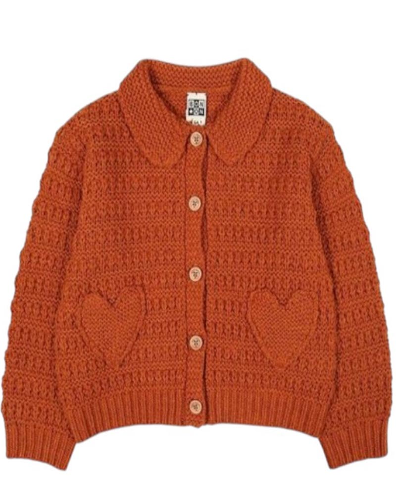 Cardigan da bambina realizzato in misto lana merino. Presenta colletto a punta, maniche lunghe, chiusura frontale con bottoni e finiture a coste. È decorata con due tasche a forma di cuore applicate sul davanti.