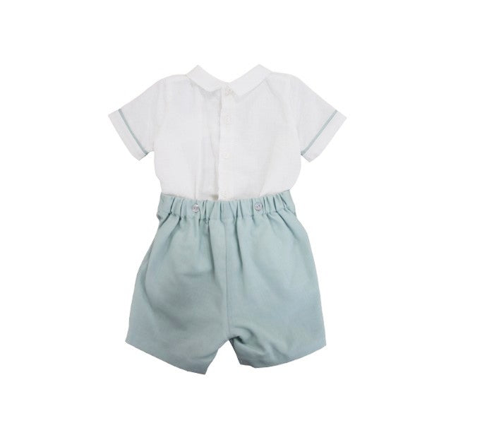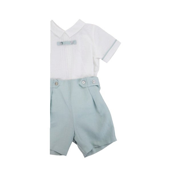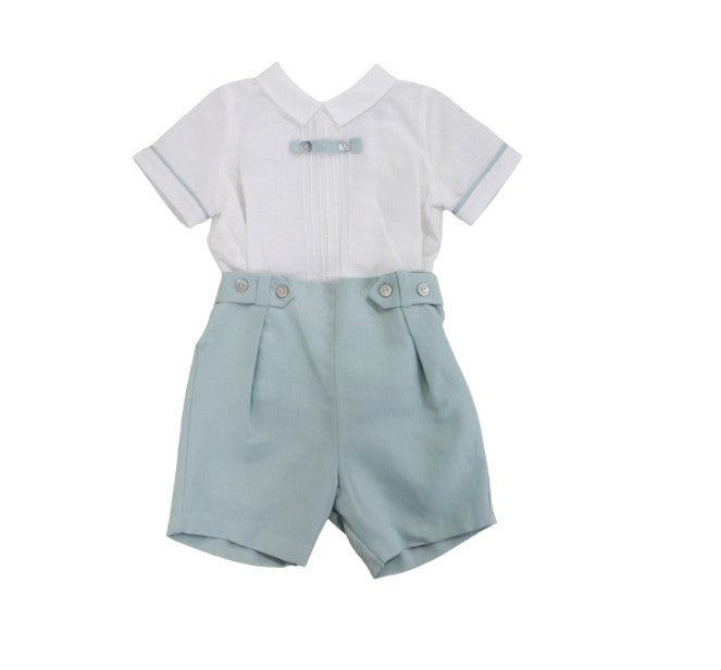Boys' shirt and pants set, with mother-of-pearl buttons and pleats on the front for a refined look. Pants with internal buttons for a perfect fit. Perfect for ceremonies and special occasions.