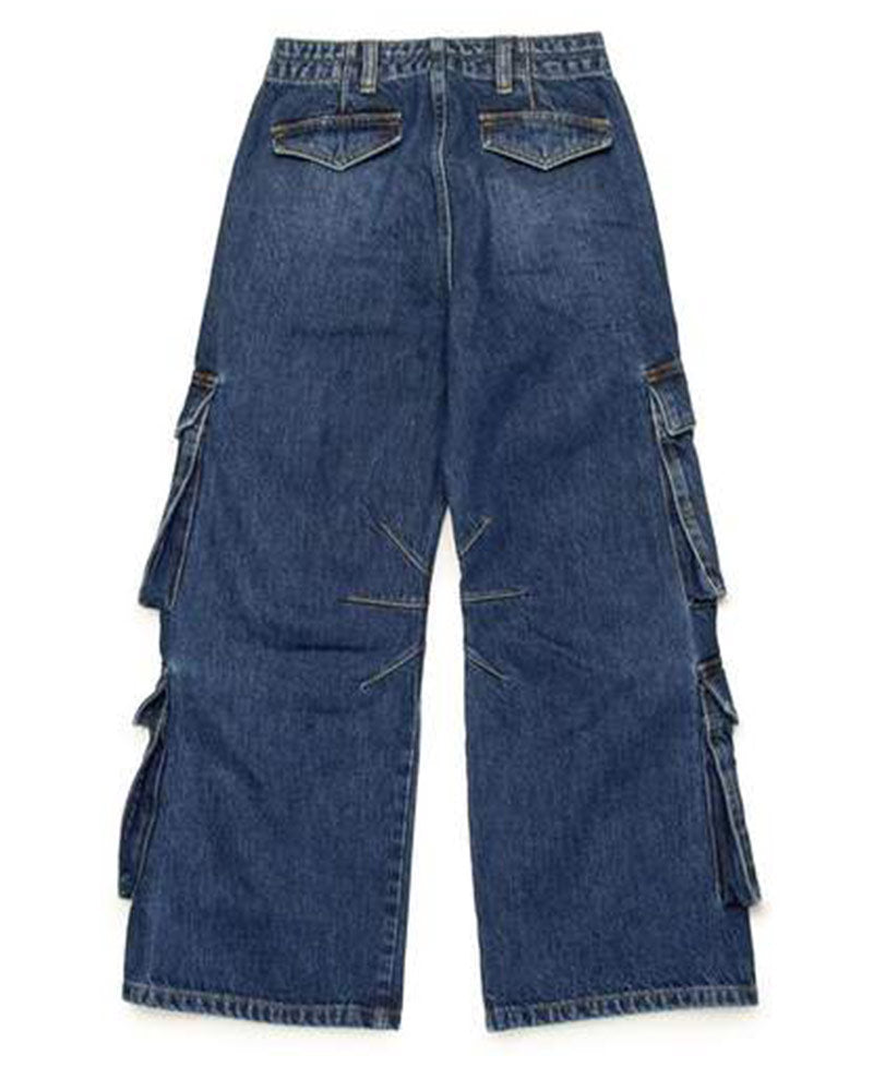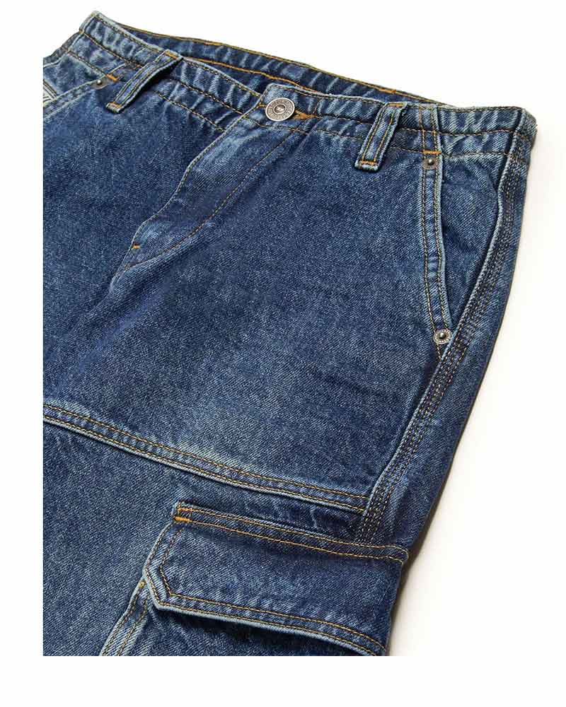 Jeans a vita media realizzati in denim di cotone, modello cargo. Presentano chiusura frontale con bottone e zip, gamba larga, tasche laterali america, quattro tasche cargo ai lati e patch logo applicata sul davanti.