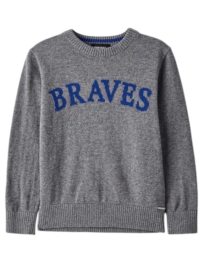 Maglia grigia da bambino realizzata in misto cotone e lana. Presenta collo tondo, maniche lunghe e finiture a coste. È decorata con logo ad intarsio sulla parte anteriore.