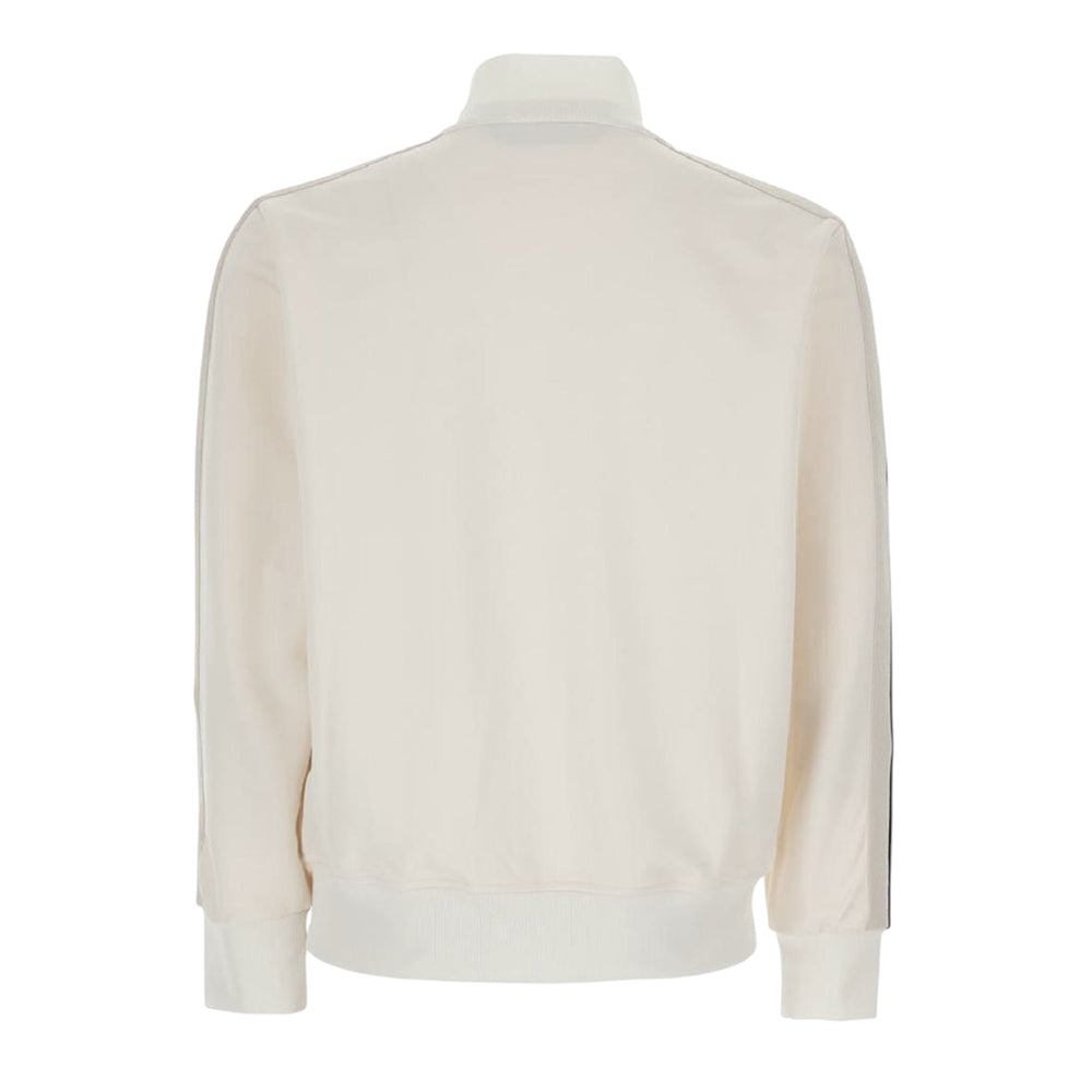 Felpa avorio in acetato, caratterizzata da collo alto a coste, maniche lunghe, chiusura frontale con zip, due tasche laterali a filetto e finiture a coste. È decorata con bande in maglia écru sulle maniche e logo ricamato sul petto.