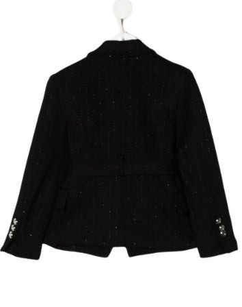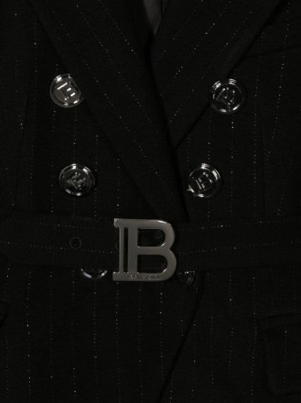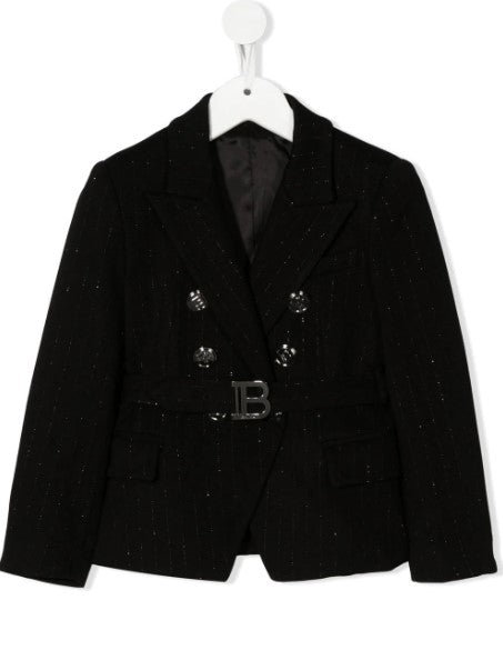 Double-breasted jacket, lurex fabric, logo buttons, belt at the waist.