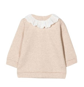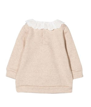 Baby sweatshirt with San Gallo lace ruffles collar and embroidered logo, button fastening on the back.