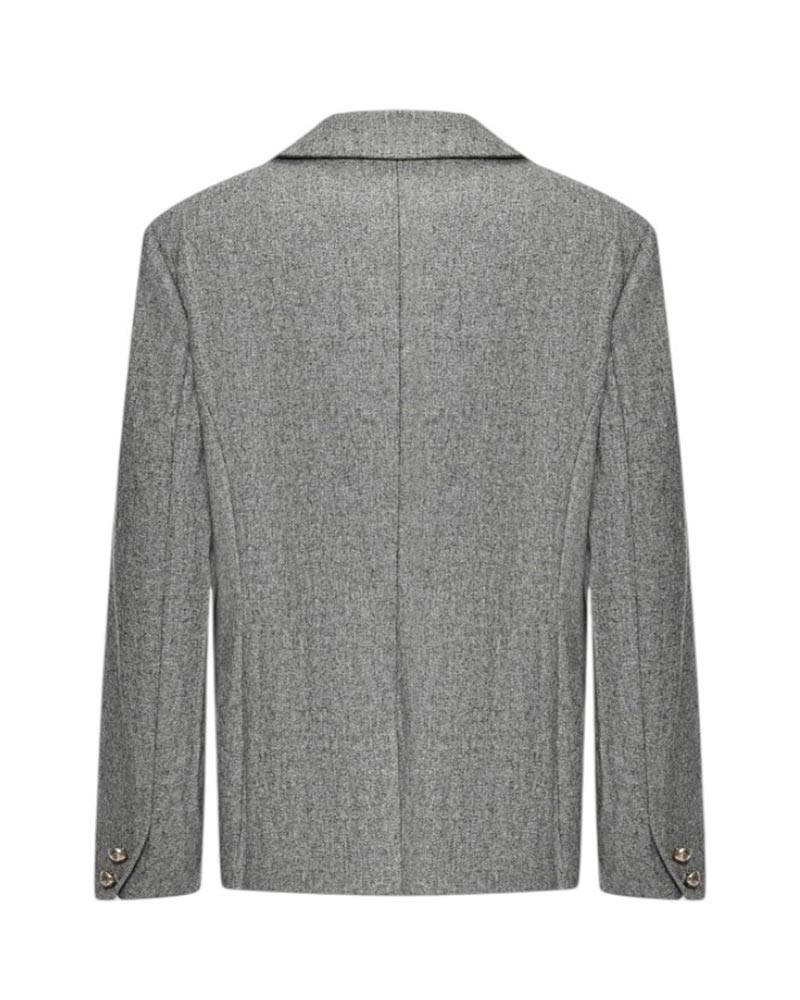 Giacca doppiopetto grigia realizzata in misto lana da bambina. Presenta collo a revers, chiusura frontale con bottoni gioiello, maniche lunghe e due tasche con patta applicate sul davanti.