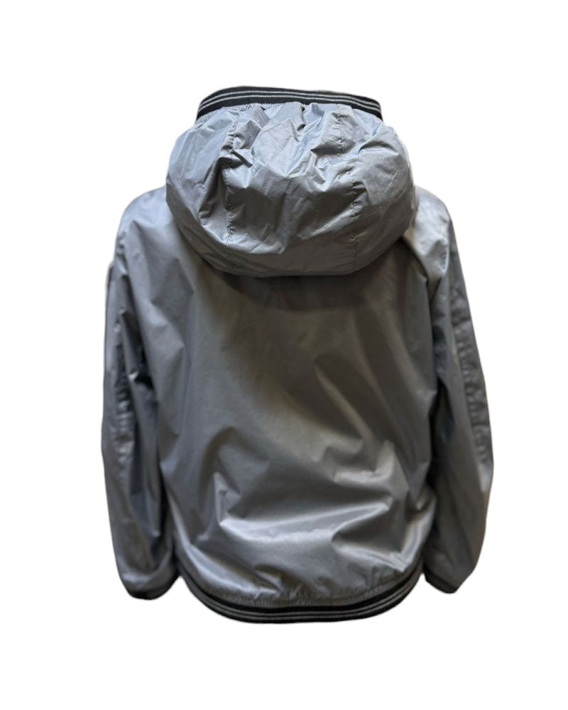 Giacca a vento reversibile in nylon confort touch e nylon lucido contrasto colore, chiusura frontale con zip, cappuccio fisso, tasche con zip in entrambi i lati, elastico rigato su polsini, fondo e cappuccio, patch e passante con logo.