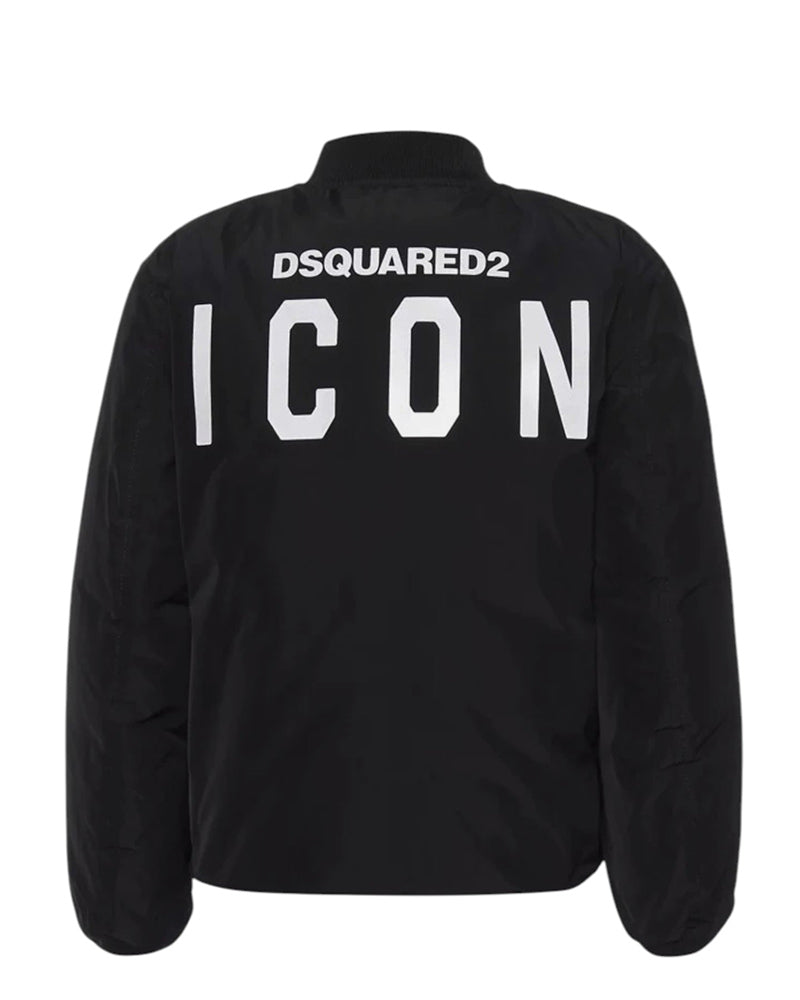 Children's padded jacket with ribbed collar, front zip fastening, contrasting logo print on the back, elasticated hem and cuffs.