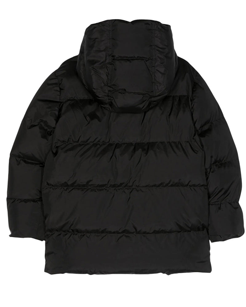 Quilted jacket with fixed hood, logo printed on the front, hidden front fastening, two welt pockets.