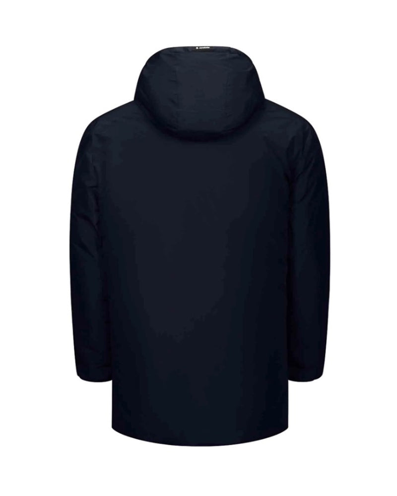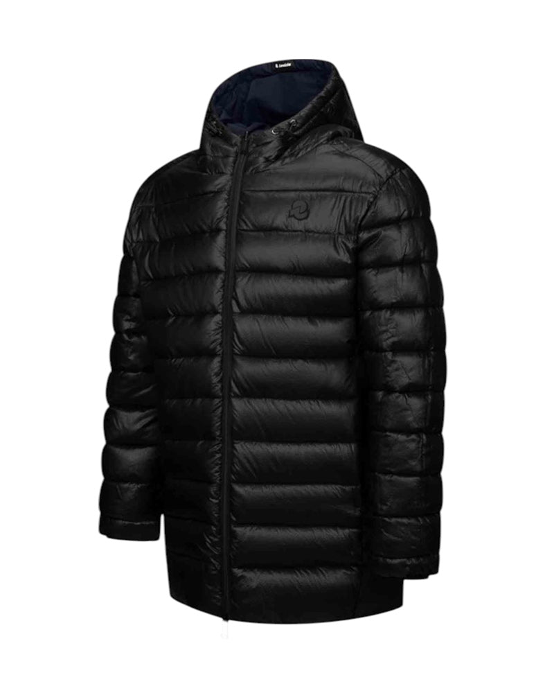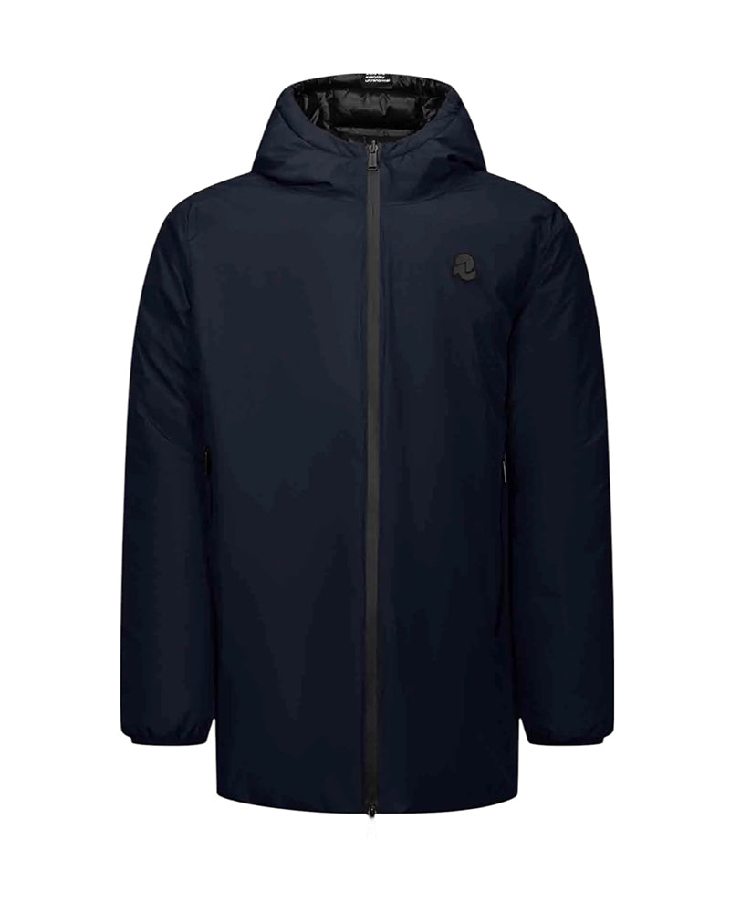 Giubbino reversibile da bambino, con cappuccio fisso, chiusura frontale con zip, maniche lunghe, due tasche a filetto laterali, patch logo applicata sul petto e orlo dritto. Presenta un lato in tessuto laminato blu 100% poliestere. L'altro lato realizzato in 100% nylon nero, con design trapuntato.