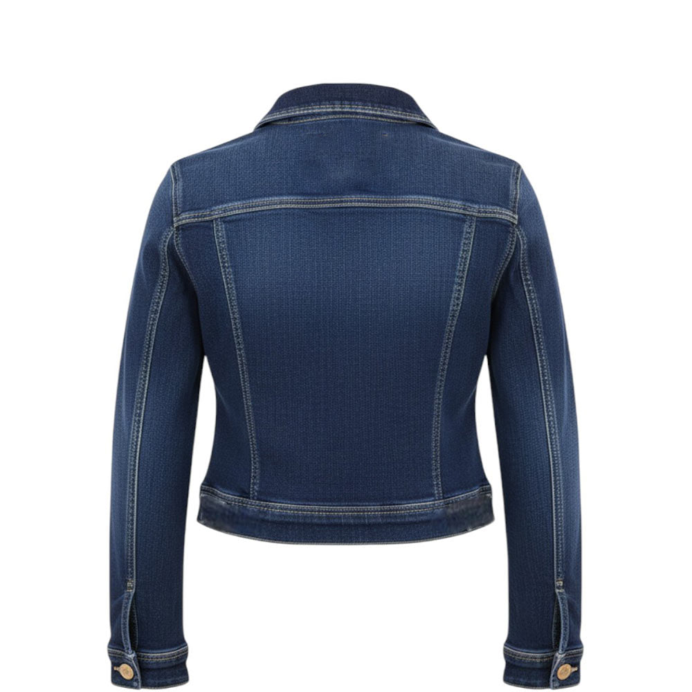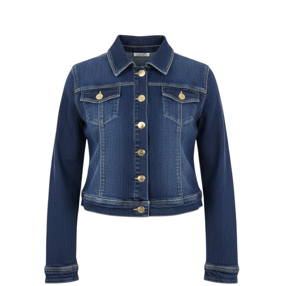 Giubbino realizzato in denim di cotone. Presenta colletto a punta, chiusura frontale con bottoni, maniche lunghe, polsi abbottonati, due tasche con patta applicate sul petto e orlo dritto.