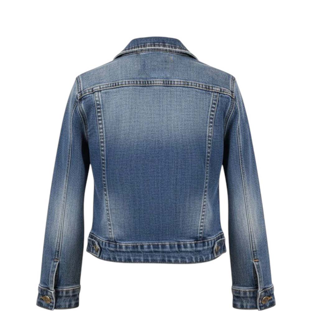 Giubbino realizzato in denim di cotone. Presenta colletto a punta, chiusura frontale con bottoni, maniche lunghe, due tasche laterali a filo e due tasche con patta applicate sul petto.