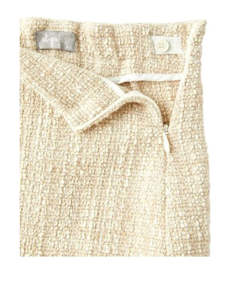 Gonna realizzata in tessuto tweed, sfoderato con pannello interno elasticizzato sul retro e bottone per una vestibilità regolabile. Chiusura con zip nascosta sul lato. La gonna è rifinita con bordino sfrangiato sul fondo.