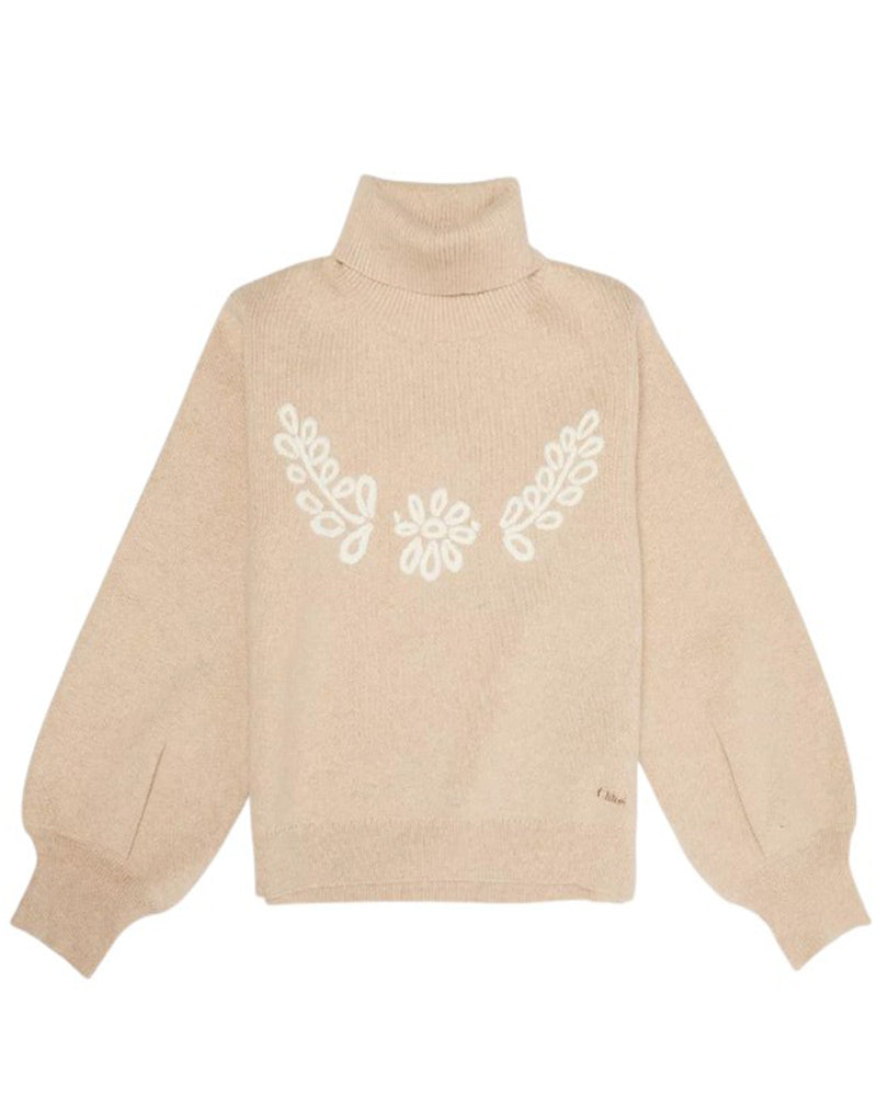 Maglia da bambina realizzata in misto cotone e lana. Presenta collo alto, maniche lunghe a sbuffo e finiture a coste. È decorata con ricamo sul davanti e con placca logo applicata sul lato.