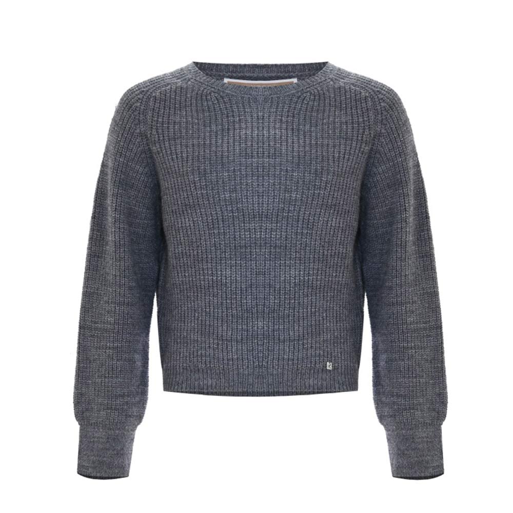 Maglia Teodata realizzata in filato di misto viscosa. Presenta lavorazione a treccia, collo tondo, maniche lunhe, taglio cropped e finiture a coste. È decorata con applicaione logo in metallo sul davanti.