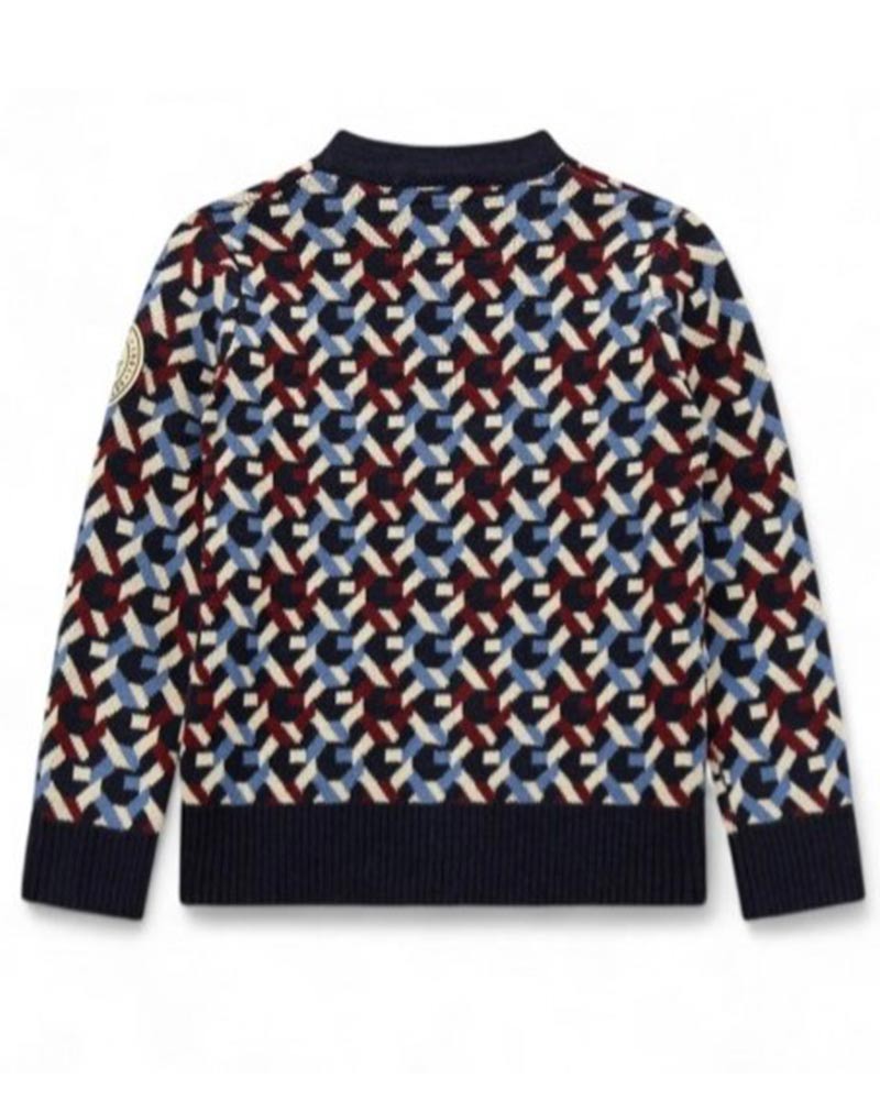 Cardigan realizzato in misto cotone da neonato. Presenta lavorazione a maglia, scollo a V, maniche lunghe, chiusura frontale con bottoni e finiture a coste. È decorato con fantasia logo jacquard all-over e con patch logo applicata sulla manica.