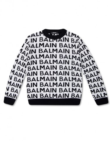 Crew neck, long sleeve, all-over logo pattern, contrasting ribbed trim.