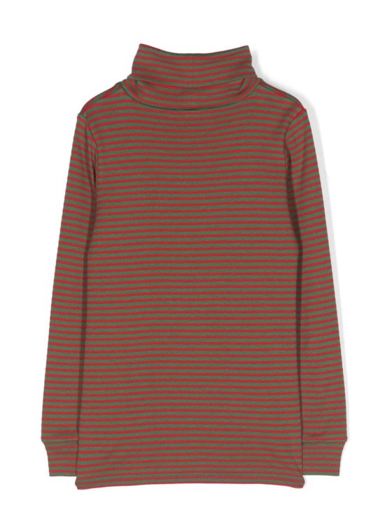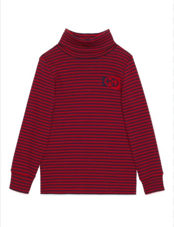 High-neck wool sweater, striped pattern, logo printed on the front.