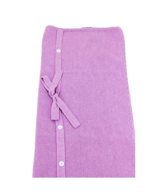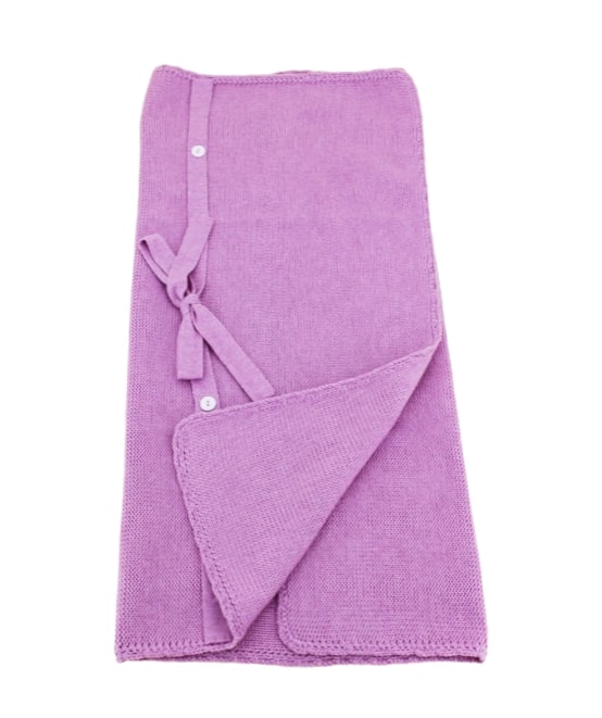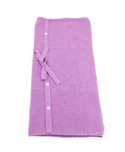 Little Bear lilac newborn blanket with bow and buttons.