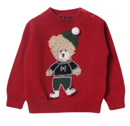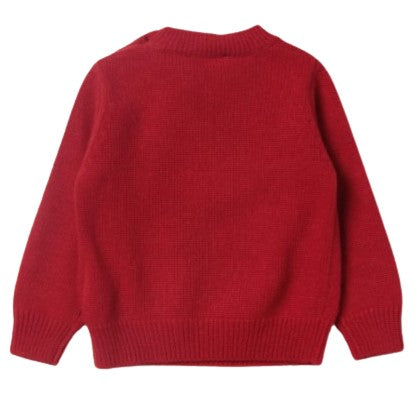 Crew neck wool sweater, with button fastening on the shoulder, with embroidery and appliques.