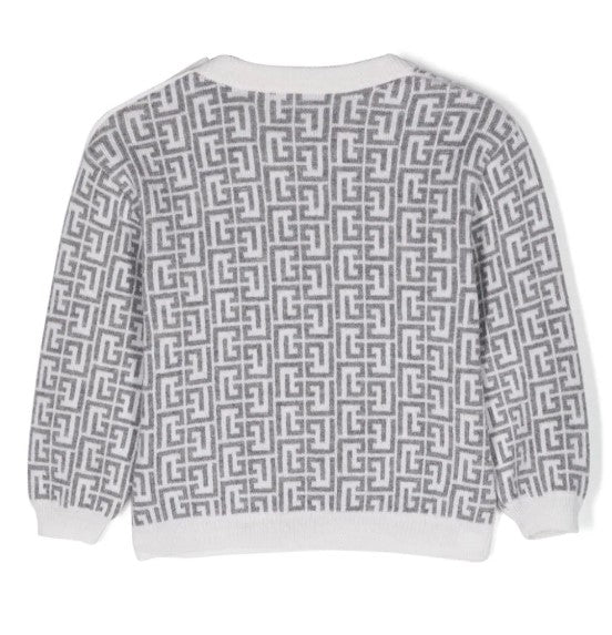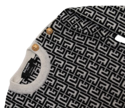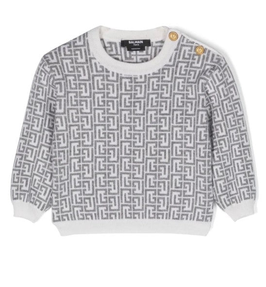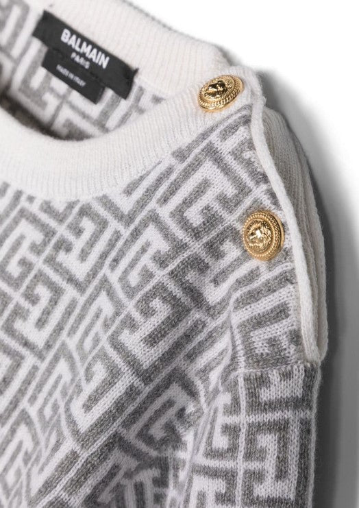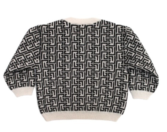 Crew neck sweater, all-over logo fabric, buttons applied on the shoulder, contrasting logo.