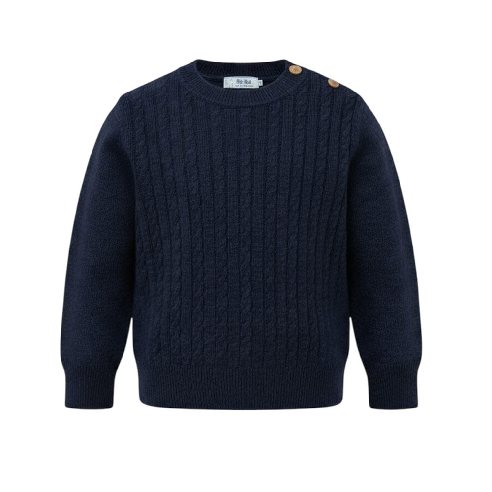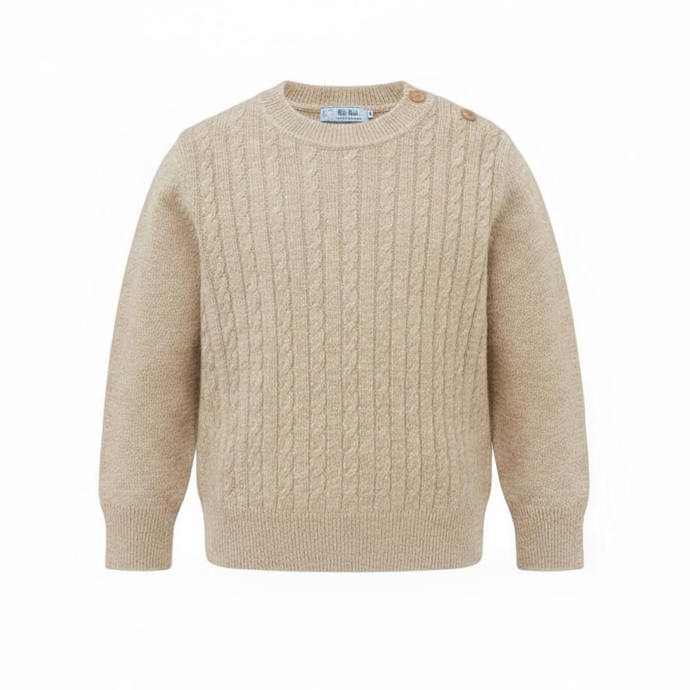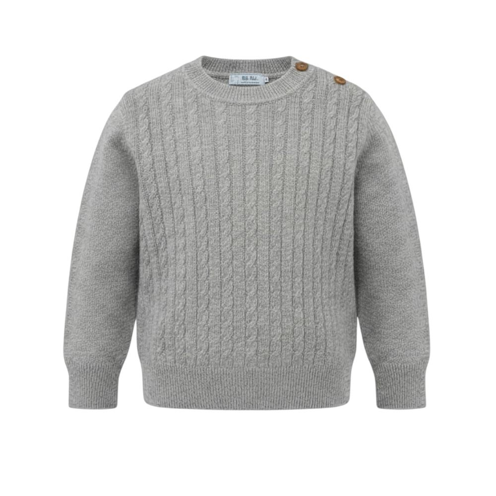 Maglia realizzata in misto lana, caratterizzata da motivo a treccia sul davanti, collo rotondo, chiusura con bottoncini sulla spalla, maniche lunghe e finiture a costine.
