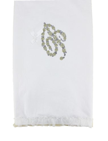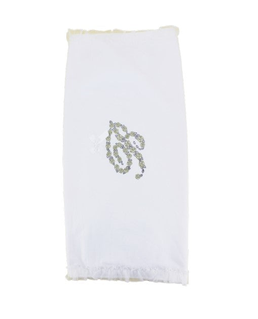 Model with brand initial in the center with gold and silver glitter, and border with voile ruffles.