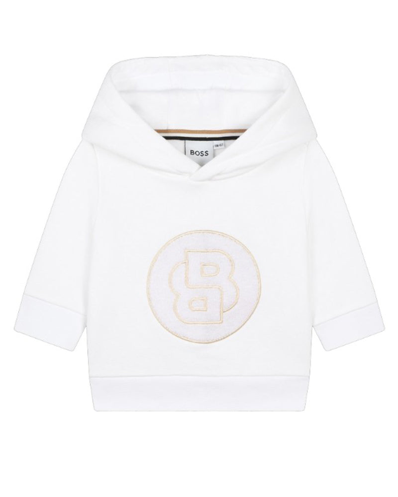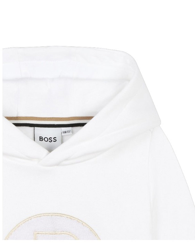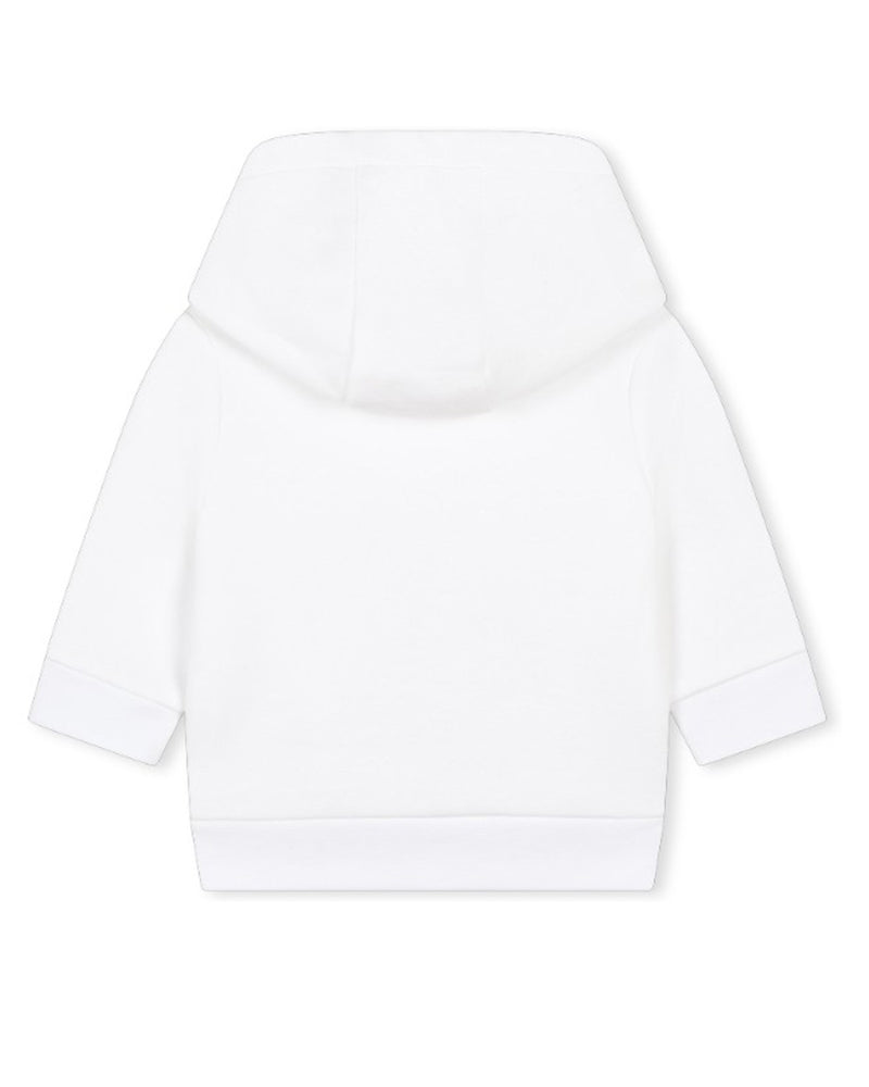 Felpa con cappuccio realizzata in cotone garzato da neonato. Presenta maniche lunghe, applicazione logo effetto punto spugna sulla parte anteriore, fodera in pile, polsi e orlo a coste.
