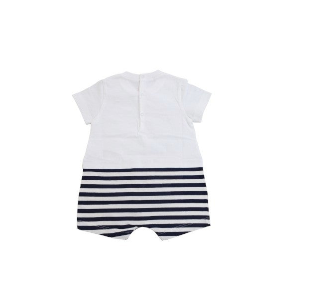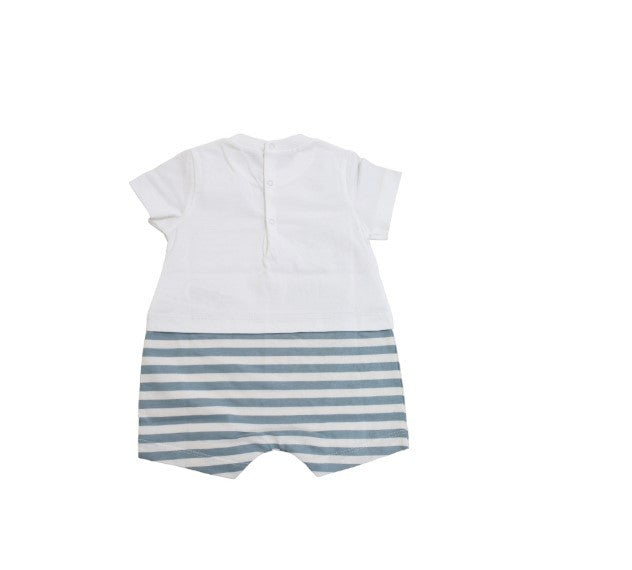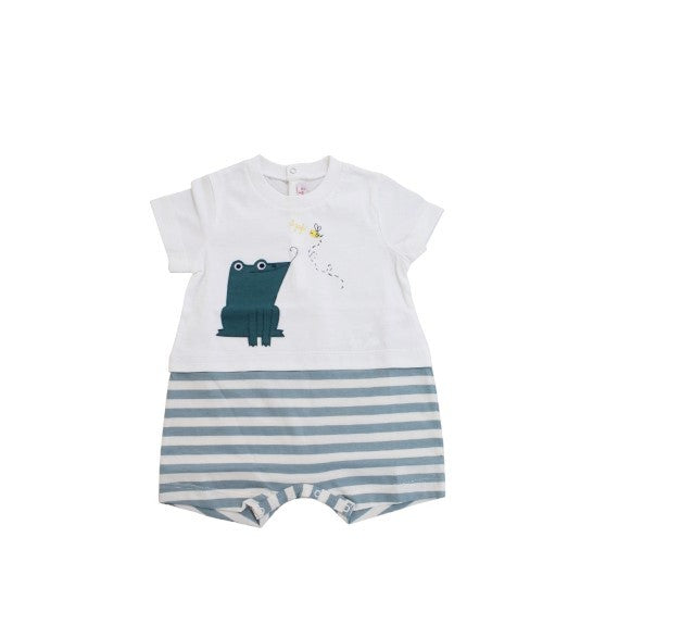 Owl romper with half sleeves and no collar with a frog print sewn on the front and stripes at the bottom