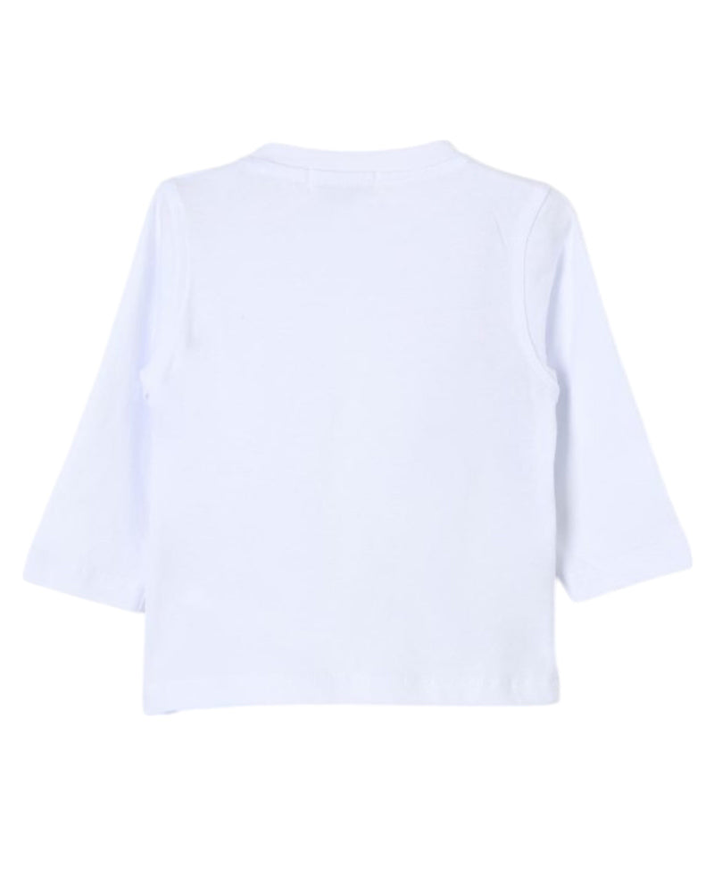 T-shirt bianca da neonato, realizzata in jersey di cotone. Presenta collo tondo, maniche lunghe, chiusura con bottoncini a pressione sulla spalla e orlo dritto. È decorata con stampa Teddy sulla parte anteriore.